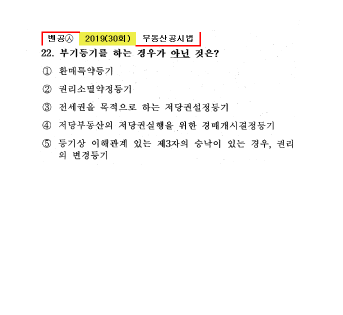 30회㉦22. 부기등기를 하는 경우가 아닌 것은? ① 환매특약등기 ② 권리소멸약정등기 ③ 전세권을 목적으로 하는 저당권설정등기 ● 저당부동산의 저당권실행을 위한 경매기시결정등기㉦주등기 ⑤ 등기상 이해관계 있는 제3자의 승낙이 있는 경우, 권리의 변경등기 |