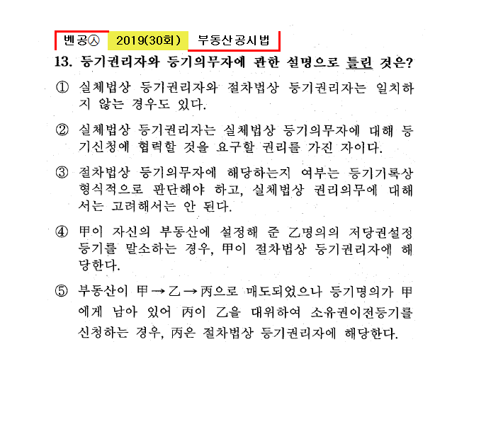30회㉦13. 등기권리자와 등기의무자에 관한 설명으로 틀린 것은? ① 실체법상 등기권리자와 절차법상 등기권리자는 일치하지 않는 경우도 있다. ② 실체법상 등기권리자는 실체법상 등기의무자에 대해 등기신청에 협력할 것을 요구할 권리를 가진 자이다. ③ 절차법상 등기의무자에 해당하는지 여부는 등기기록상 형식적으로 판단해야 한고, 실체법상 권리의미에 대해서는 고려해서는 안 된다. ④ 甲이 자신의 부동산에 설정해 준 乙명의의 저당권설정등기를 말소하는 경우, 甲이 절차법상 등기권리자에 해당한다. ● 부동산이 甲→乙→丙으로 매도되었으나 등기명의가 甲에게 남아 있어 丙이 乙을 대위하여 소유권이전등기를 신청하는 경우, |
