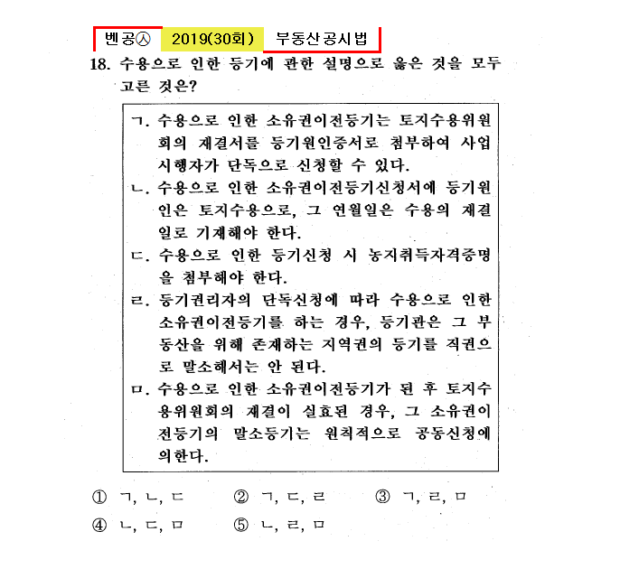 30회㉦18. 수용으로 인한 등기에 관한 설명으로 옳은 것을 모두 고른 것은? ㄱ. 수용으로 인한 소유권이전등기는 토지수용위원회의 재결서를 등기원증서로 첨부하여 사업시행자가 단독으로 신청할 수 있다. ㄴ. 수용으로 인한 소유권이전등기신청서에 등기원인은 토지수용으로, 그 연월일은 ㄷ. 수용으로 인한 등기신청 시 농지취득자격증명을 첨부 ㄹ. 등기권리자의 단독신청에 따라 수용으로 인한 소유권이전등기를 하는 경우, 등기관은 그 부동산을 위해 존재하는 지역권의 등기를 직권으로 말소해서는 안 된다. ㅁ. 수용으로 인한 소유권이전등기가 된 후 토지수용위원회의 재결이 실효된 경우, 그 소유권이 전등기의 말소등기는 원칙적으로 공동신청에 의한다. ① ㄱ, ㄴ, ㄷ ② ㄱ, ㄷ, ㄹ ● ㄱ, ㄹ, ㅁ ④ ㄴ, ㄷ, ㅁ ⑤ ㄴ, ㄹ, ㅁ |