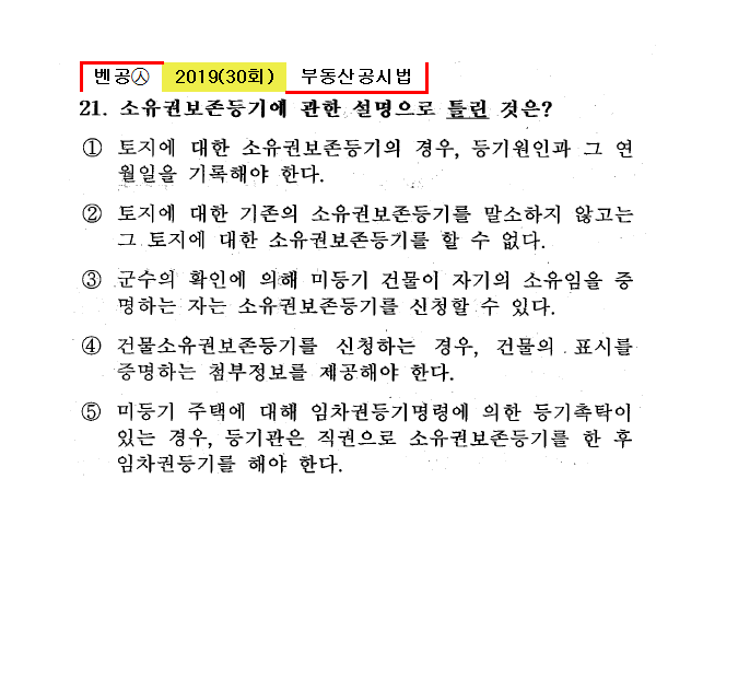 30회㉦21. 소유권보존등기에 관한 설명으로 틀린 것은? ● 토지에 대한 소유권보존등기의 경우, 등기원인과 그 연월일을 기록 ② 토지에 대한 기존의 소유권보존등기를 말소하지 않고는 그 토지에 대한 소유권보존등기를 할 수 없다. ③ 군수의 확인에 의해 미등기 건물이 자기의 소유임을 중명하는 자는 소유권보존등기를 신청할 수 있다. ④ 건물소유권보존등기를 신청하는 경우, 건물의 표시를 증명하는 첨부정보를 제공해야 한다. ⑤ 미등기 주택에 대해 임차권등기명령에 의한 등기촉탁이 있는 경우, 등기관은 직권으로 소유권보존등기를 한 후 임차권등기를 해야 한다. |