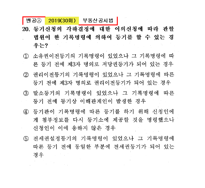 30회㉦20. 등기신청의 각하결정에 대한 이의신청에 따라 관할 법원이 한 기록명령에 의하여 등기를 할 수 있는 경우는? ● 소유권이전등기의 기록명령이 있었으나 그 기록명령에 따른 등기 전에 제3자 명의로 저당권등기가 되어 있는 경우 ② 권리이전증기의 기록명령이 있었으나 그 기록명령에 따른 등기 전에 제3자 명의로 권리이전등기가 되어 있는 경우㉦기록명령에 따른 등기를 할 수 없다 ③ 말소등기의 기록명령이 있었으나 그 기록명령에 따른 등기 전에 등기상 이해관계인이 발생한 경우㉦기록명령에 따른 등기를 할 수 없다 ④ 등기관이 기록명령에 따른 등기를 하기 위해 신청인에게 첨부정보를 다시 등기소에 제공할 것을 명령했으나 신청인이 이에 응하지 않은 경우㉦기록명령에 따른 등기를 할 수 없다 ⑤ 전세권설정등기의 기록명령이 있었으나 그 기록명령에 따른 등기 전에 동일한 부분에 전세권등기가 되어 있는 경우㉦기록명령에 따른 등기를 할 수 없다 |