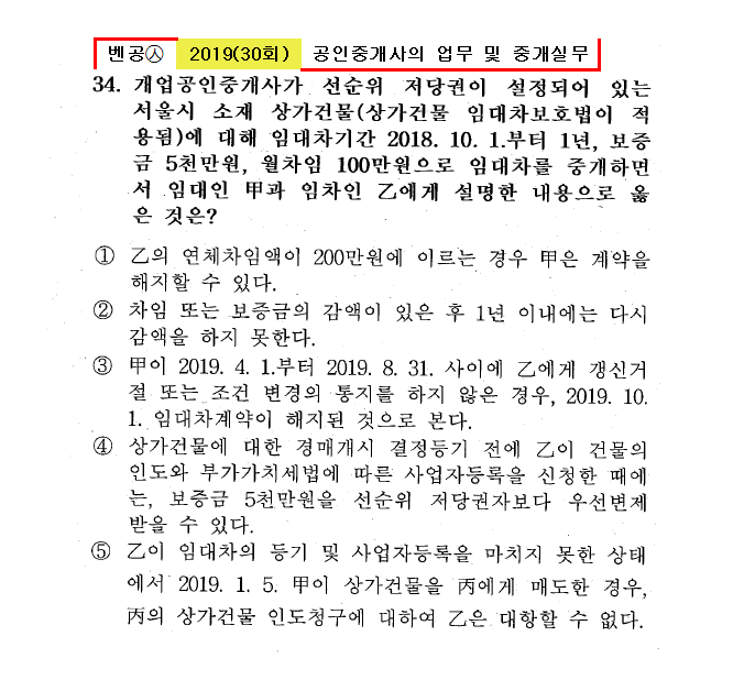 30회㉦34. 개업공인중개사가 선순위 저당권이 설정되어 있는 서울시 소재 상가건물(상가건물 임대차보호법이 적용됨)에 대해 임대차기간 2018. 10. 1.부터 1년, 보증금 5천만원, 월차임 100만원으로 임대차를 중개하면서 임대인 甲과 임차인 乙에게 설명한 내용으로 옳은 것은? ① 乙의 연체차임액이 200만원에 이르는 경우 甲은 계약을 해지할 수 있다. ② 차임 또는 보증금의 감액이 있은 후 1년 이내에는 다시 감액을 하지 못한다. ③ 甲이 2019. 4. 1.부터 2019. 8. 31. 사이에 乙에게 갱신거절 또는 조건 변경의 통지를 하지 않은 경우, 2019. 10. 1. 임대차계약이 해지된 것으로 본다. ④ 상가건물에 대한 경매기시 결정등기 전에 乙이 건물의 인도와 부가가치세법에 따른 사업자등록을 신청한 때에는, 보증금 5천만원을 선순위 저당권자보다 우선변제 받을 수 있다. ● 乙이 임대차의 등기 및 사업자등록을 마치지 못한 상태에서 2019. 1. 5. 甲이 상가건물을 丙에게 매도한 경우, 丙의 상가건물 인도청구에 대하여 乙은 대항할 수 없다. |