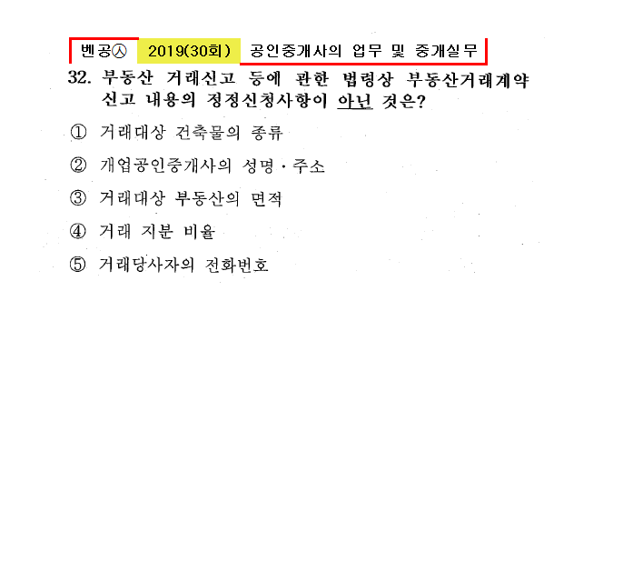 30회㉦32. 부동산 거래신고 등에 관한 법령상 부동산거래계약신고 내용의 정정신청사항이 아닌 것은? ① 거래대상 건축물의 종류 ● 개업공인중개사의 성명․주소 ③ 거래대상 부동산의 면적 ④ 거래 지분 비율 ⑤ 거래당사자의 전화번호 |