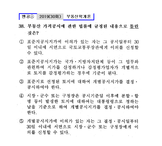 ⑤ 개별공시지가에 이의가 있는 자는 그 결정․공시일부터 30일 이내에 서면으로 시장․군수 또는 구청장에게 이의를 신청할 수 있다.