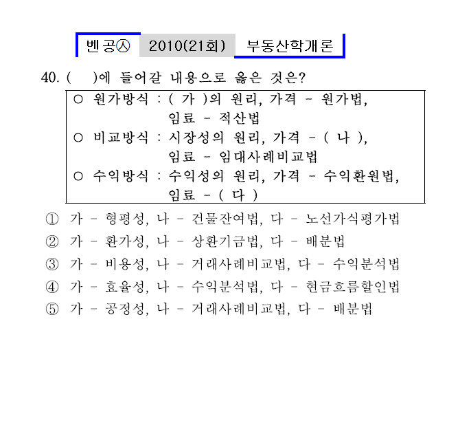 ㅇ 원가방식 : ( 가 )의 원리, 가격 – 원가법, 임료 - 적산법 ㅇ 비교방식 : 시장성의 원리, 가격 - ( 나 ), 임료 - 임대사례비교법 ㅇ 수익방식 : 수익성의 원리, 가격 – 수익환원법, 임료 - ( 다 ) |