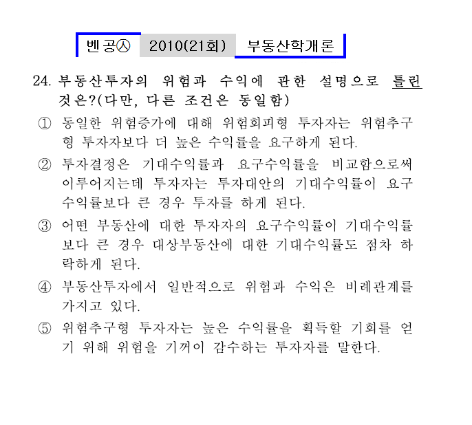 21회㉦24. 부동산투자의 위험과 수익에 관한 설명으로 틀린 것은?(다만, 다른 조건은 동일함)