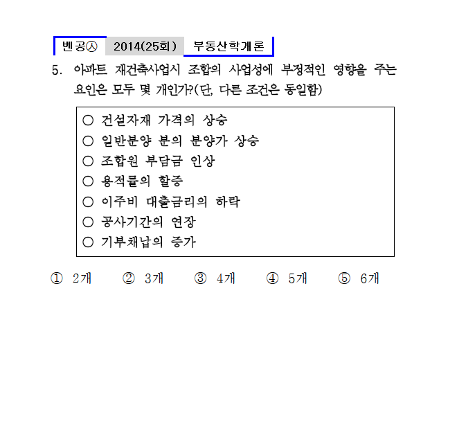 25회㉦5. 아파트 재건축사업시 조합의 사업성에 부정적인 영향을 주는 요인은 모두 몇 개인가?(단, 다른 조건은 동일함)