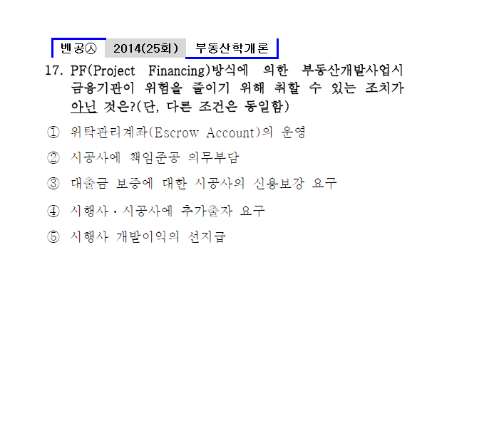25회㉦17. PF(Project Financing)방식에 의한 부동산개발사업시 금융기관이 위험을 줄이기 위해 취할 수 있는 조치가 아닌 것은?(단, 다른 조건은 동일함)