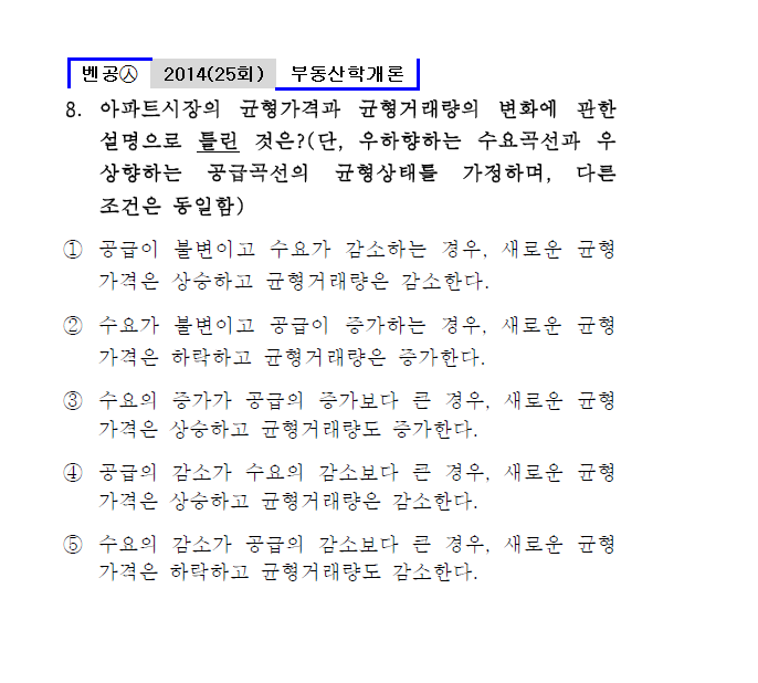 25회㉦8. 아파트시장의 균형가격과 균형거래량의 변화에 관한 설명으로 틀린 것은?(단, 우하향하는 수요곡선과 우상향하는 공급곡선의 균형상태를 가정하며, 다른 조건은 동일함)