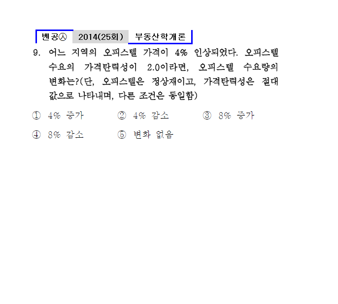 25회㉦9. 어느 지역의 오피스텔 가격이 4% 인상되었다. 오피스텔 수요의 가격탄력성이 2.0이라면, 오피스텔 수요량의 변화는?(단, 오피스텔은 정상재이고, 가격탄력성은 절대값으로 나타내며, 다른 조건은 동일함)