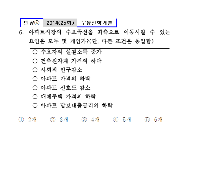 25회㉦6. 아파트시장의 수요곡선을 좌측으로 이동시킬 수 있는 요인은 모두 몇 개인가?(단, 다른 조건은 동일함)