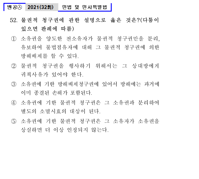 벤공㉦32회_52. 물권적 청구권에 관한 설명으로 옳은 것은? (다툼이 있으면 판례에 따름) ① 소유권을 양도한 전소유자가 물권적 청구권만을 분리, 유보하여 불법점유자에 대해 그 물권적 청구권에 의한 방해배제를 할 수 있다. ② 물권적 청구권을 행사하기 위해서는 그 상대방에게 귀책사유가 있어야 한다. ③ 소유권에 기한 방해배제청구권에 있어서 방해에는 과거에 이미 종결된 손해가 포함된다. ④ 소유권에 기한 물권적 청구권은 그 소유권과 분리하여 별도의 소멸시효의 대상이 된다. ⑤ 소유권에 기한 물권적 청구권은 그 소유자가 소유권을 상실하면 더 이상 인정되지 않는다. |