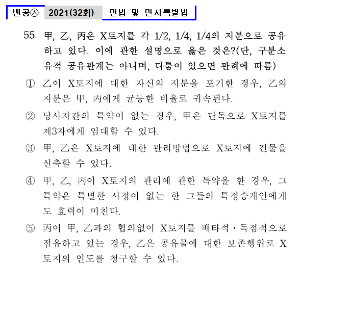 벤공㉦32회_55. 甲, 乙, 丙은 X토지를 각 1/2, 1/4, 1/4의 지분으로 공유하고 있다. 이에 관한 설명으로 옳은 것은? (단, 구분소유적 공유관계는 아니며, 다툼이 있으면 판례에 따름) ① 乙이 X토지에 대한 자신의 지분을 포기한 경우, 乙의 지분은 甲, 丙에게 균등한 비율로 귀속된다. ② 당사자간의 특약이 없는 경우, 甲은 단독으로 X토지를 제3자에게 임대할 수 있다. ③ 甲, 乙은 X토지에 대한 관리방법으로 X토지에 건물을 신축할 수 있다. ④ 甲, 乙, 丙이 X토지의 관리에 관한 특약을 한 경우, 그 특약은 특별한 사정이 없는 한 그들의 특정승계인에게도 효력이 미친다. ⑤ 丙이 甲, 乙과의 협의없이 X토지를 배타적ㆍ독점적으로 점유하고 있는 경우, 乙은 공유물에 대한 보존행위로 X토지의 인도를 청구할 수 있다. |
