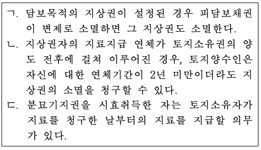 벤공㉦32회_59. 지상권에 관한 설명으로 틀린 것을 모두 고른 것은? (다툼이 있으면 판례에 따름) ![]() ① ㄱ ② ㄴ ③ ㄷ ④ ㄱ, ㄴ ⑤ ㄴ, ㄷ |
