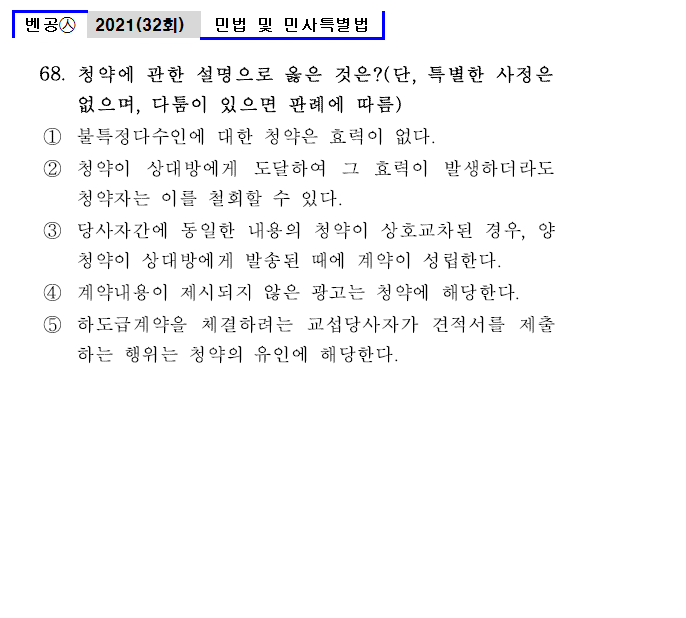 | 벤공㉦32회_68. 청약에 관한 설명으로 옳은 것은? (단, 특별한 사정은 없으며, 다툼이 있으면 판례에 따름) ① 불특정다수인에 대한 청약은 효력이 없다. ② 청약이 상대방에게 도달하여 그 효력이 발생하더라도 청약자는 이를 철회할 수 있다. ③ 당사자간에 동일한 내용의 청약이 상호교차된 경우, 양청약이 상대방에게 발송된 때에 계약이 성립한다. ④ 계약내용이 제시되지 않은 광고는 청약에 해당한다. ⑤ 하도급계약을 체결하려는 교섭당사자가 견적서를 제출하는 행위는 청약의 유인에 해당한다. |