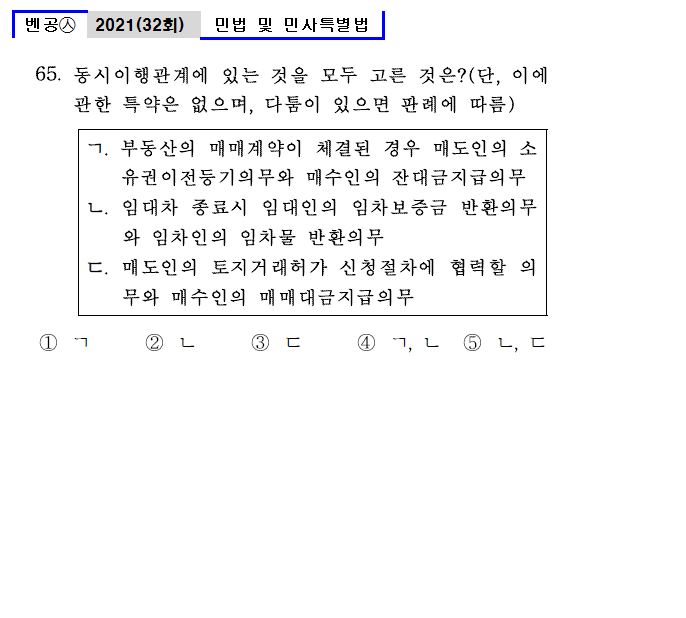 | 벤공㉦32회_65. 동시이행관계에 있는 것을 모두 고른 것은? (단, 이에 관한 특약은 없으며, 다툼이 있으면 판례에 따름) ![]() ① ㄱ ② ㄴ ③ ㄷ ④ ㄱ, ㄴ ⑤ ㄴ, ㄷ |