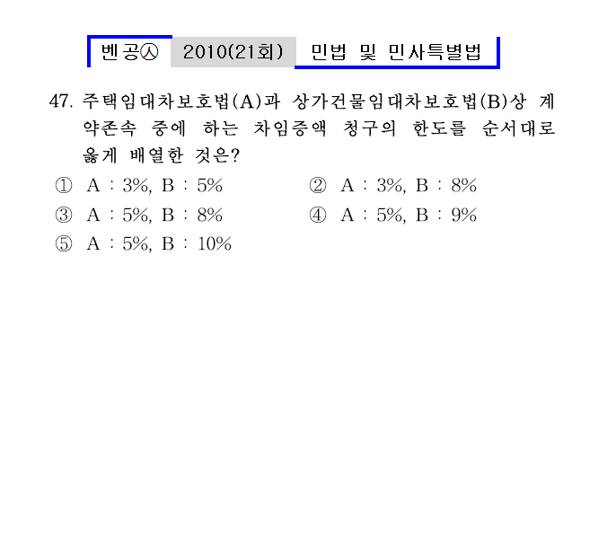 21회㉦47. 주택임대차보호법(A)과 상가건물임대차보호법(B)상 계약존속 중에 하는 차임증액 청구의 한도를 순서대로 옳게 배열한 것은?