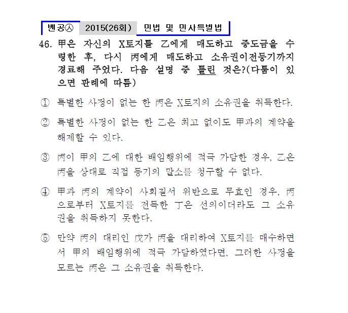 26회㉦46. 甲은 자신의 X토지를 乙에게 매도하고 중도금을 수령한 후, 다시 丙에게 매도하고 소유권이전등기까지 경료해 주었다. 다음 설명 중 틀린 것은?(다툼이 있으면 판례에 따름)