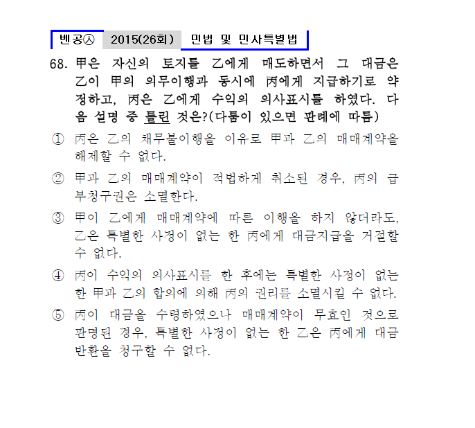 26회㉦68. 甲은 자신의 토지를 乙에게 매도하면서 그 대금은 乙이 甲의 의무이행과 동시에 丙에게 지급하기로 약정하고, 丙은 乙에게 수익의 의사표시를 하였다. 다음 설명 중 틀린 것은?(다툼이 있으면 판례에 따름)