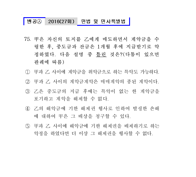 27회㉦75. 甲은 자신의 토지를 乙에게 매도하면서 계약금을 수령한 후, 중도금과 잔금은 1개월 후에 지급받기로 약정하였다. 다음 설명 중 틀린 것은?(다툼이 있으면 판례에 따름)