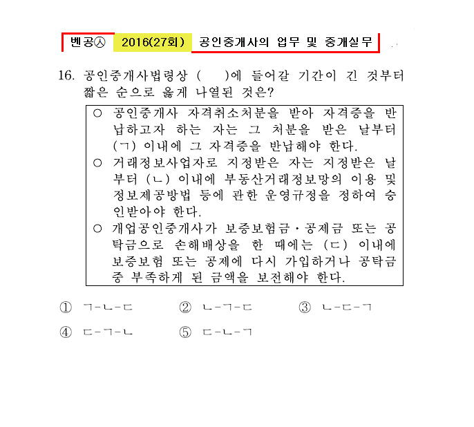 27회㉦16. 공인중개사법령상 ( )에 들어갈 기간이 긴 것부터 짧은 순으로 옳게 나열된 것은?