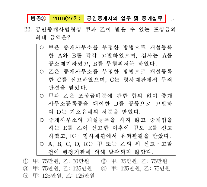 ㅇ 甲은 중개사무소를 부정한 방법으로 개설등록한 A와 B를 각각 고발하였으며, 검사는 A를 공소제기하였고, B를 무혐의처분 하였다. ㅇ 乙은 중개사무소를 부정한 방법으로 개설등록한 C를 신고하였으며, C는 형사재판에서 무죄판결을 받았다. ㅇ 甲과 乙은 포상금배분에 간한 합의 없이 중개사무소등록증을 대여한 D를 공동으로 고발하여 D는 기소유예의 처분을 받았다. ㅇ 중개사무소의 개설등록을 하지 않고 중개업을 하는 E를 乙이 신고한 이후에 甲도 E를 신고하였고, E는 형사재판에서 유죄판결을 받았다. ㅇ A, B, C, D, E는 甲 또는 乙의 위 신고․고발 전에 행정기관에 의해 발각되지 않았다. |