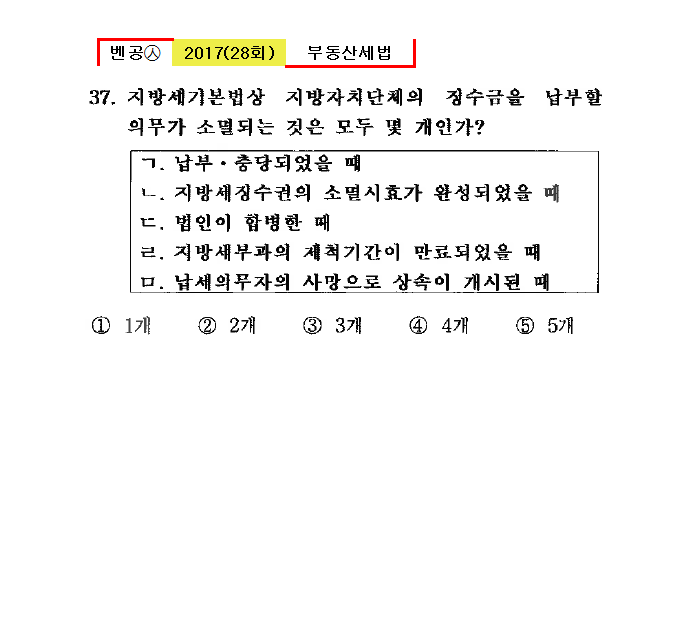 ㄱ. 납부․충당되었을 때 ㄴ. 지방세징수권의 소멸시효가 완성되었을 때 ㄷ. 법인이 합병한 때 ㄹ. 지방세부과의 제척기간이 만료되었을 때 ㅁ. 납세의무자의 사망으로 상속이 개시된 때 |