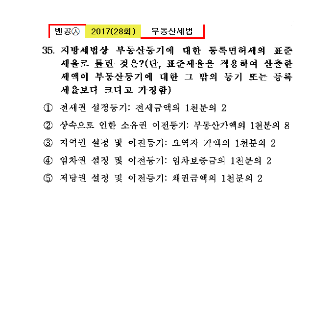 28회㉦35. 지방세법상 부동산등기에 대한 등록면허세의 표준세율로 틀린 것은?(단, 표준세율을 적용하여 산출한 세액이 부동산등기에 대한 그 밖의 등기 또는 등록세율보다 크다고 가정함)