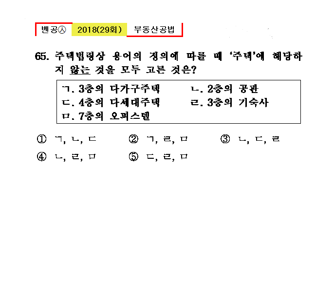 ㄱ. 3층의 다가구주택 ㄴ. 2층의 공관 ㄷ. 4층의 다세대주택 ㄹ. 3층의 기숙사 ㅁ. 7층의 오피스텔 |