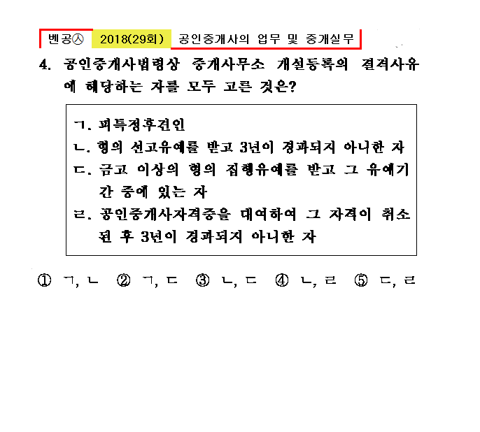 ㄱ. 피특정후견인 ㄴ. 형의 선고유예를 받고 3년이 경과되지 아니한 자 ㄷ. 금고 이상의 형의 집행유예를 받고 그 유예기간 중에 있는 자 ㄹ. 공인중개사자격증을 대여하여 그 자격이 취소된 후 3년이 경과되지 아니한 자 |