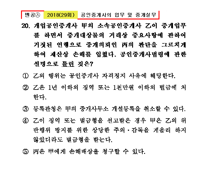 29회㉦20. 개업공인중개사 甲의 소속공인중개사 乙이 중개업무를 하면서 중개대상물의 거래상 중요사항에 관하여 거짓된 언행으로 중개의뢰인 丙의 판단을 그르치게 하여 재산상 손해를 입혔다. 공인중개사법령에 관한 설명으로 틀린 것은?