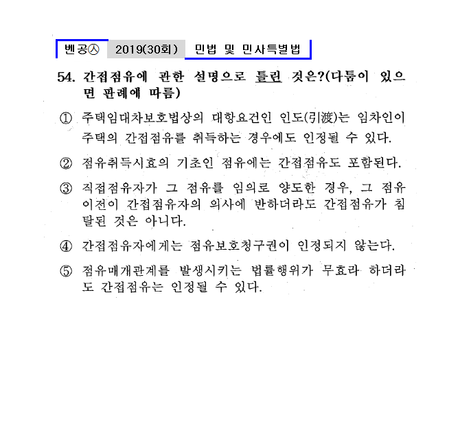 30회㉦54. 간접점유에 관한 설명으로 틀린 것은?(다툼이 있으면 판례에 따름) ① 주택임대차보호법상의 대항요건인 인도(引渡)는 임차인이 주택의 간접점유를 취득하는 경우에도 인정될 수 있다.㉦판례2005다64255 ② 점유취득시효의 기초인 점유에는 간접점유도 포함된다.㉦판례94다28468 ③ 직접점유자가 그 점유를 임의로 양도한 경우, 그 점유 이전이 간접점유자의 의사에 반하더라도 간접점유가 침탈된 것은 아니다.㉦판례92다5300 ● 간접점유자에게는 점유보호청구권이 인정되 ⑤ 점유매개관계를 발생시키는 법률행위가 무료라 하더라도 간접점유는 인정될 수 있다. |