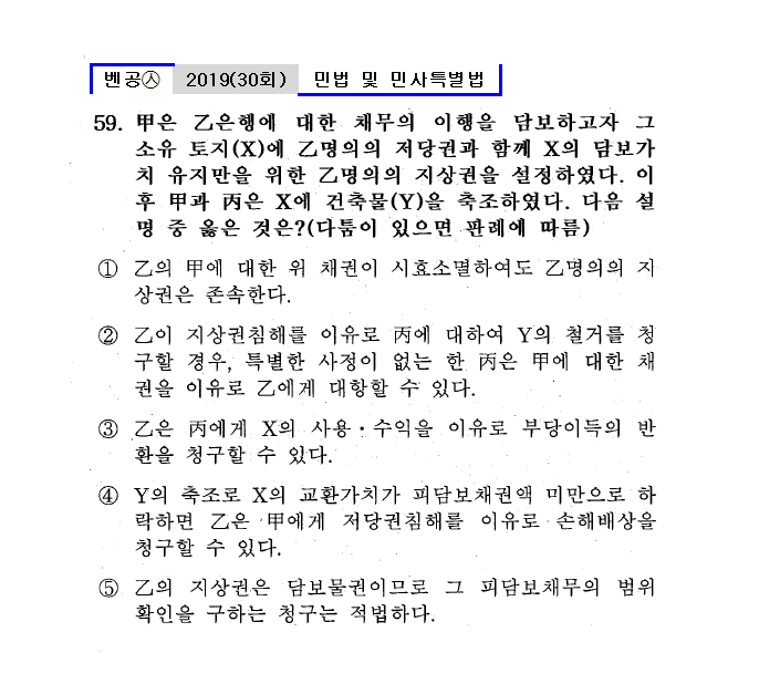 30회㉦59. 甲은 乙은행에 대한 채무의 이행을 담보하고자 그 소유 토지(X)에 乙명의의 저당권과 함께 X의 담보가치 유지만을 위한 乙명의의 지상권을 설정하였다. 이 후 甲과 丙은 X에 건축물(Y)을 축조하였다. 다음 설명 중 옳은 것은?(다툼이 있으면 판례에 따름) ① 乙의 甲에 대한 위 채권이 시효소멸하여도 乙명의의 지상권은 ② 乙이 지상권침해를 이유로 丙에 대하여 Y의 철거를 청구할 경우, 특별한 사정이 없는 한 丙은 甲에 대한 채권을 이유로 乙에게 대항할 수 ③ 乙은 丙에게 X의 사용•수익을 이유로 부당이득의 반환을 청구할 수 ● Y의 축조로 X의 교환가치가 피담보채권액 미만으로 하락하면 乙은 甲에게 저당권침해를 이유로 손해배상을 청구할 수 있다.㉦민법제750조(불법행위의 내용) ⑤ 乙의 지상권은 담보물권이므로 그 피담보채무의 범위 확인을 구하는 청구는 |