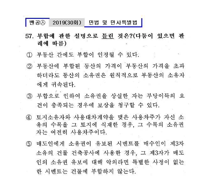 30회㉦57. 부합에 관한 설명으로 틀린 것은?(다툼이 있으면 판례에 따름) ① 부동산 간에도 부합이 인정될 수 있다. ② 부동산에 부합된 동산의 가격이 부동산의 가격을 초과하더라도 동산의 소유권은 원칙적으로 부동산의 소유자에게 귀속된다.㉦민법제256조(부동산에의 부합) ③ 부합으로 인하여 소유권을 상실한 자는 부당이득의 요건이 충족되는 경우에 보상을 청구할 수 있다.㉦판례2008나42951 ④ 토지소유자와 사용대차계약을 맺은 사용차주가 자신 소유의 수목을 그 토지에 식재한 경우, 그 수목의 소유권자는 여전히 사용차주이다.㉦판례89다카21095 ● 매도인에게 소유권이 유보된 시멘트를 매수인이 제3자 소유의 건물 건축공사에 사용한 경우, 그 제3자가 매도인의 소유권 유보에 대해 악의라면 특별한 사정이 없는 한 시멘트는 건물에 부합하 |