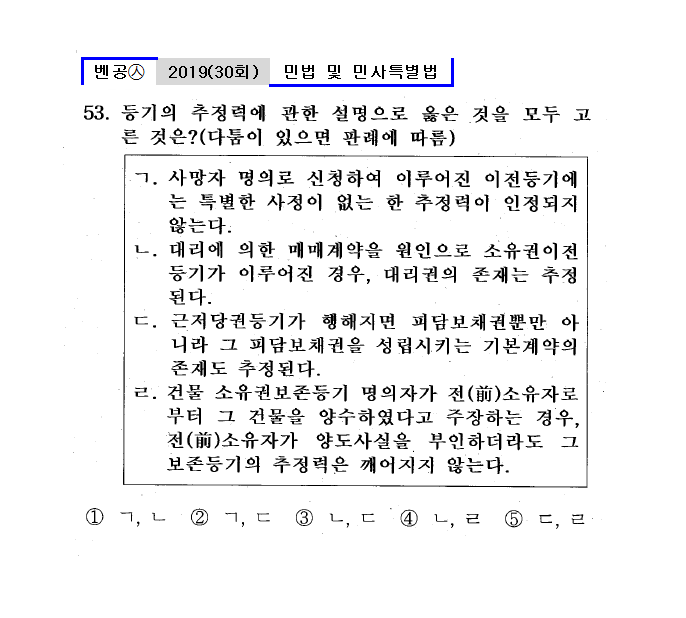 30회㉦53. 등기의 추정력에 관한 설명으로 옳은 것을 모두 고른 것은?(다툼이 있으면 판례에 따름) ㄱ. 사망자 명의로 신청하여 이루어진 이전등기에는 특별한 사정이 없는 한 추정력이 인정되니 않는다.㉦판례95다51991 ㄴ. 대리에 의한 매매계약을 원인으로 소유권이전등기가 이루어진 경우, 대리권의 존재는 추정된다.㉦판례2009다37831 ㄷ. 근저당권등기가 행해지면 피담보채권뿐만 아니라 그 피담보채권을 성립시키는 기본계약의 존재도 추정 ㄹ. 건물 소유권보존등기 명의자가 전(前)소유자로부터 그 건물을 양수하였다고 주장하는 경우, 전(前)소유자가 양도사실을 부인하더라도 그 보존등기의 추정력은 깨어 ● ㄱ, ㄴ ② ㄱ, ㄷ ③ ㄴ, ㄷ ④ ㄴ, ㄹ ⑤ ㄷ, ㄹ |