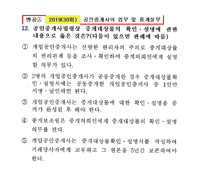 30회㉦12. 공인중개사법령상 중개대상물의 확인-설명에 관한 내용으로 옳은 것은?(다툼이 있으면 판례에 따름) ● 개업공인중개사는 선량한 관리자의 주의로 중개대상물의 권리관계 등을 조사․확인하여 중개의뢰인에게 설명할 의무가 있다. ② 2명의 개업공인중개사가 공동중개한 경우 중개대상물확인․설명서에는 공동중개한 개업공인중개사 중 ③ 개업공인중개사는 중개대상물에 대한 확인-설명을 중개가 완성 ④ ⑤ 개업공인중개사는 중개대상물확인-설명서를 작성하여 거래당사자에게 교부하고 그 원본을 |