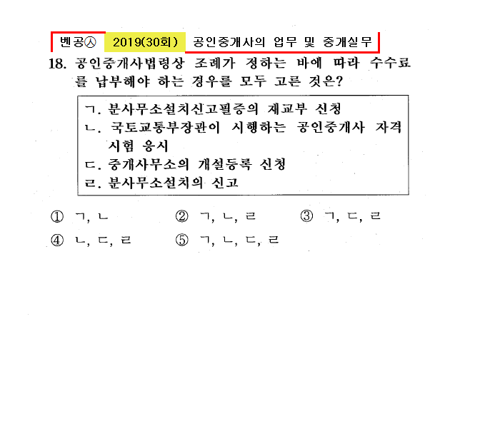 30회㉦18 공인중개사법령상 조례가 정하는 바에 따라 수수료를 납부해야 하는 경우를 모두 고른 것은? ㄱ. 분사무소설치신고필증의 재교부 신청 ㄴ. ㄷ. 중개사무소의 개설등록 신청 ㄹ. 분사무소설치의 신고 ① ㄱ, ㄴ ② ㄱ, ㄴ, ㄹ ● ㄱ, ㄷ, ㄹ ④ ㄴ, ㄷ, ㄹ ⑤ ㄱ, ㄴ, ㄷ, ㄹ |