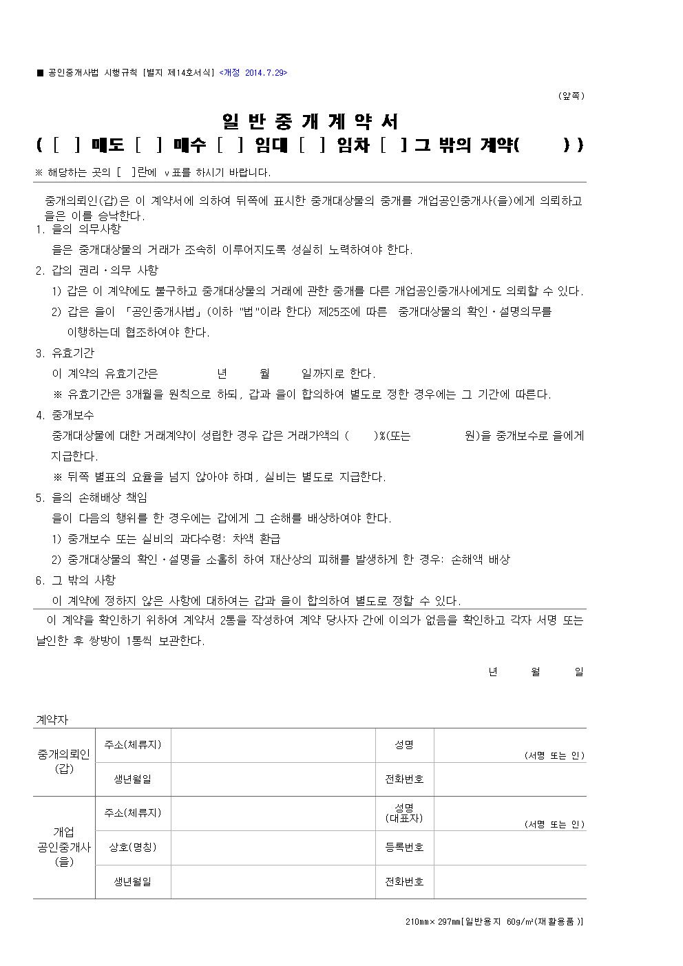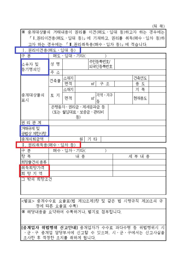 30회㉦19. 무주택자인 甲이 주택을 물색하여 매수하기 위해 개업공인중개사인 乙과 일반중개계약을 체결하고자 한다. 이 경우 공인중개사법령상 표준서식인 일반중개계약서에 기재하는 항목을 모두 고른 것은? ㄱ. 소유자 및 등기명의인㉦권리이전용(매도-임대) 기재란 작성항목 ㄴ. 희망 지역 ㄷ. 취득 희망가격 ㄹ. 거래규제 및 공법상 제한사항㉦권리이전용(매도-임대) 기재란 작성항목 ① ㄷ ② ㄱ, ㄴ ● ㄴ, ㄷ ④ ㄷ, ㄹ ⑤ ㄱ, ㄴ, ㄷ |