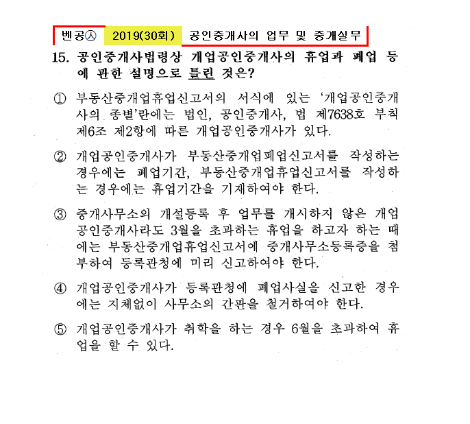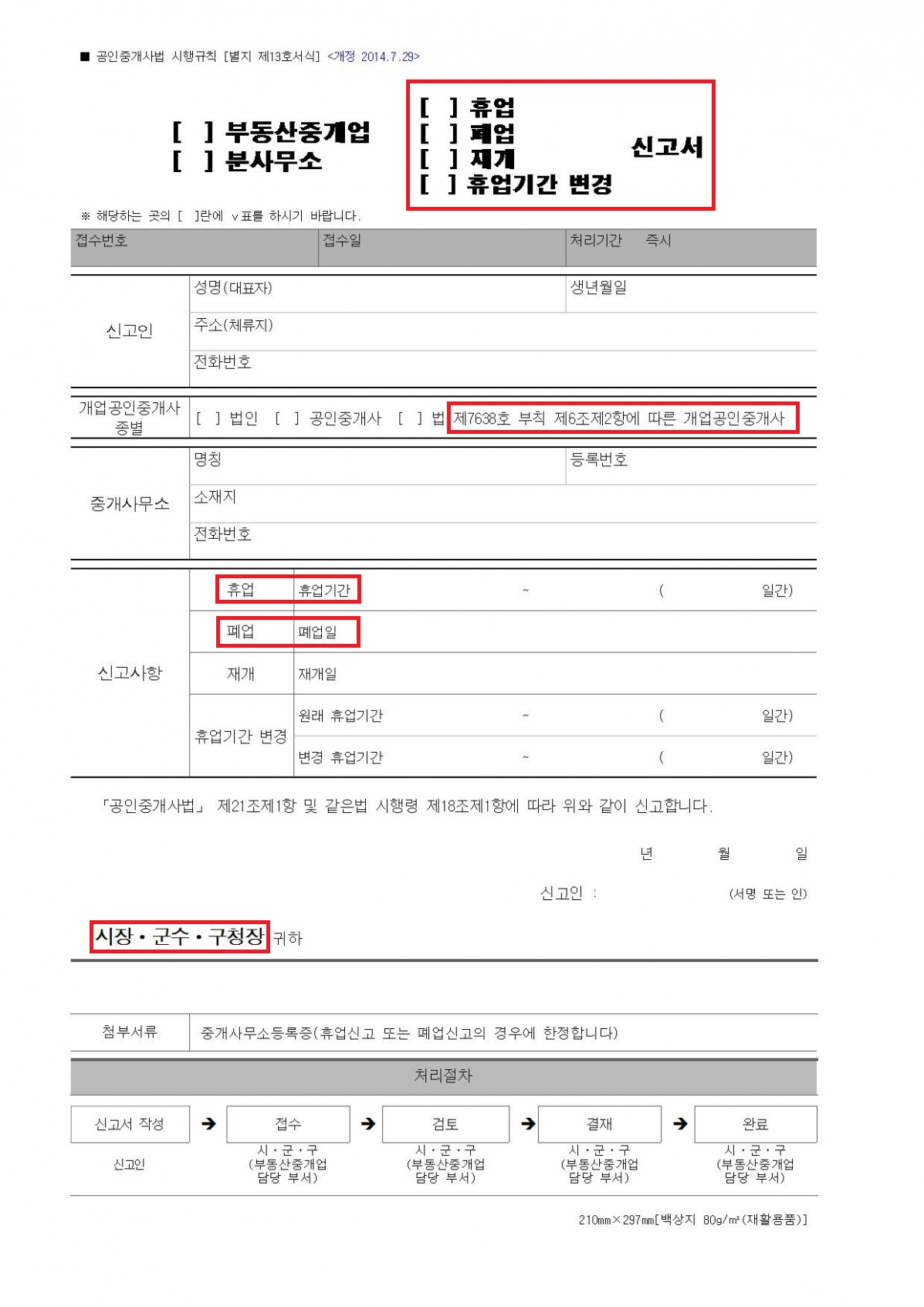 30회㉦15. 공인중개사법령상 개업공인중개사의 휴업과 폐업 등에 관한 설명으로 틀린 것은? ① 부동산중개업휴업신고서의 서식에 있는 ‘개업공인중개사의 종별’란에는 법인, 공인중개사, 법 제7638호 부칙 제6조 제2항에 따른 개업공인중개사가 있다. ● 개업공인중개사가 부동산중개업폐업신고서를 작성하는 경우에는 폐업 ③ 중개사무소의 개설등록 후 업무를 개시하지 않은 개업공인중개사라도 3월을 초과하는 휴업을 하고자 하는 때에는 부동산중개업휴업신고서에 중개사무소등록증을 첨부하여 등록관청에 미리 신고하여야 한다. ④ 개업공인중개사가 등록관청에 폐업사실을 신고한 경우에는 지체없이 사무소의 간판을 철거하여야 한다. ⑤ 개업공인중개사가 취학을 하는 경우 6월을 초과하여 휴업을 할 수 있다. |