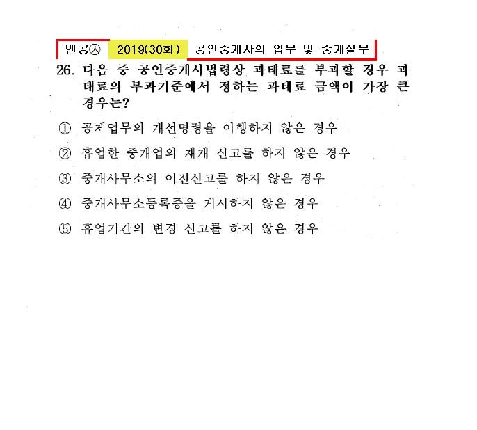 30회㉦26. 다음 중 공인중개사법령상 과태료를 부과할 경우 과태료의 부과기준에서 정하는 과태료 금액이 가장 큰 경우는? ● 공제업무의 개선명령을 이행하지 않은 경우㉦500만원 이하 ② 휴업한 중개업의 재개 신고를 하지 않은 경우㉦20만원 ③ 중개사무소의 이전신고를 하지 않은 경우㉦30만원 ④ 중개사무소등록증을 게시하지 않은 경우㉦30만원 ⑤ 휴업기간의 변경 신고를 하지 않은 경우㉦50만원 |