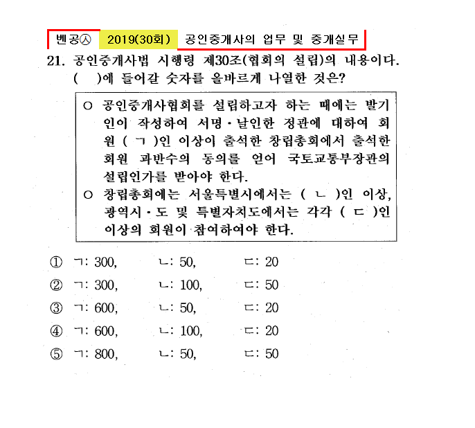 30회㉦21. 공인중개사법 시행령 제30조(협회의 설립)의 내용이다. ( )에 들어갈 숫자를 올바르게 나열한 것은? ㅇ 공인중개사협회를 설립하고자 하는 때에는 발기인이 작성하여 서명․날인한 정관에 대하여 회원 ( ㄱ )인 이상이 출석한 창립총회에서 출석한 회원 과반수의 동의를 얻어 국토교통부장관의 설립인가를 받아야 한다. ㅇ 창립총회에는 서울특별시에서는 ( ㄴ )인 이상, 광역시․도 및 특별자치도에서는 각각 ( ㄷ )인 이상의 회원이 참여하여야 한다. ① ㄱ: 300, ㄴ: 50, ㄷ: 20 ② ㄱ: 300, ㄴ: 100, ㄷ: 50 ③ ㄱ: 600, ㄴ: 50, ㄷ: 20 ● ㄱ: 600, ㄴ: 100, ㄷ: 20 ⑤ ㄱ: 800, ㄴ: 50, ㄷ: 50 |